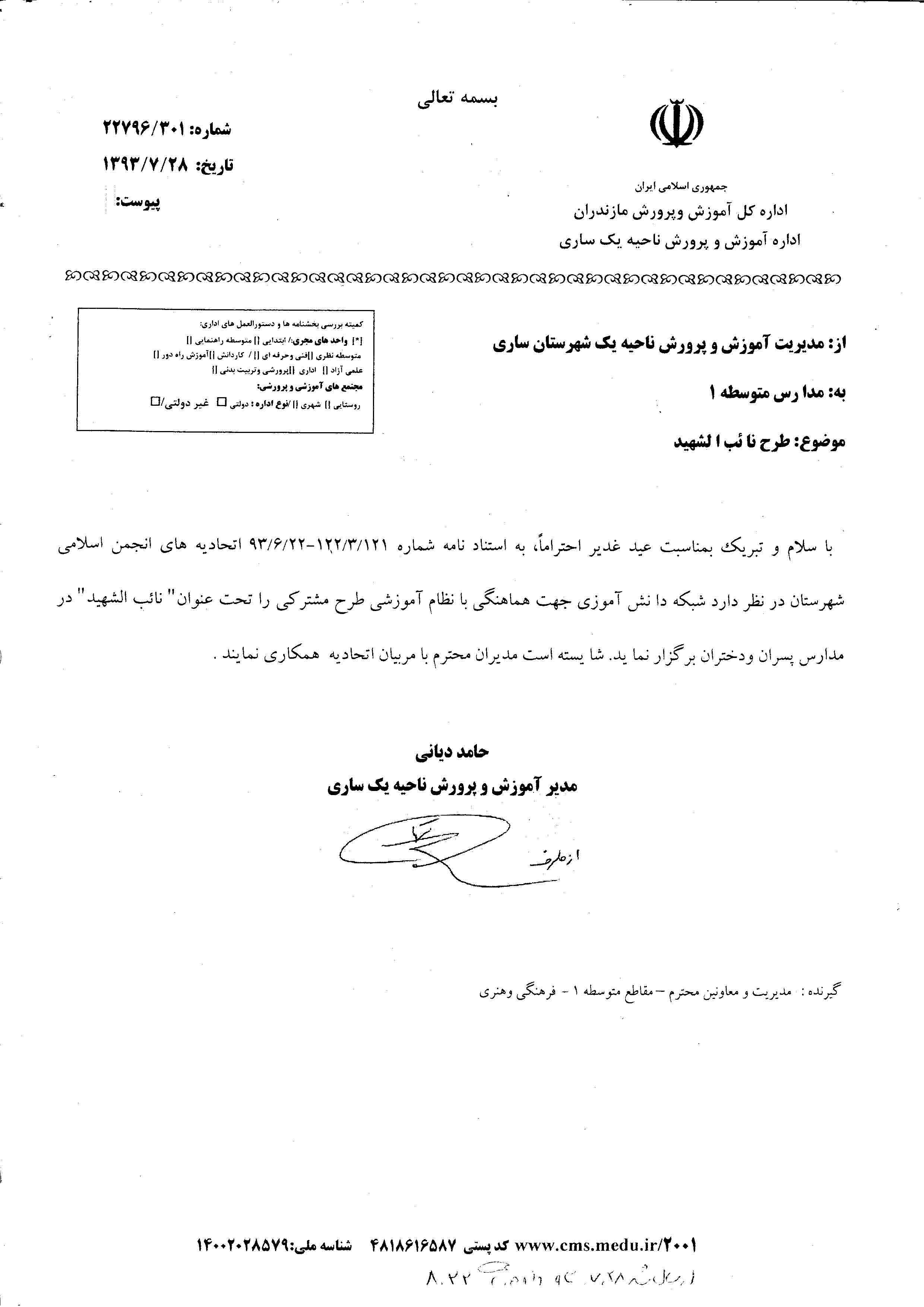 1 - بخشنامه آموزش و پرورش به مدارس ناحیه 1 و 2