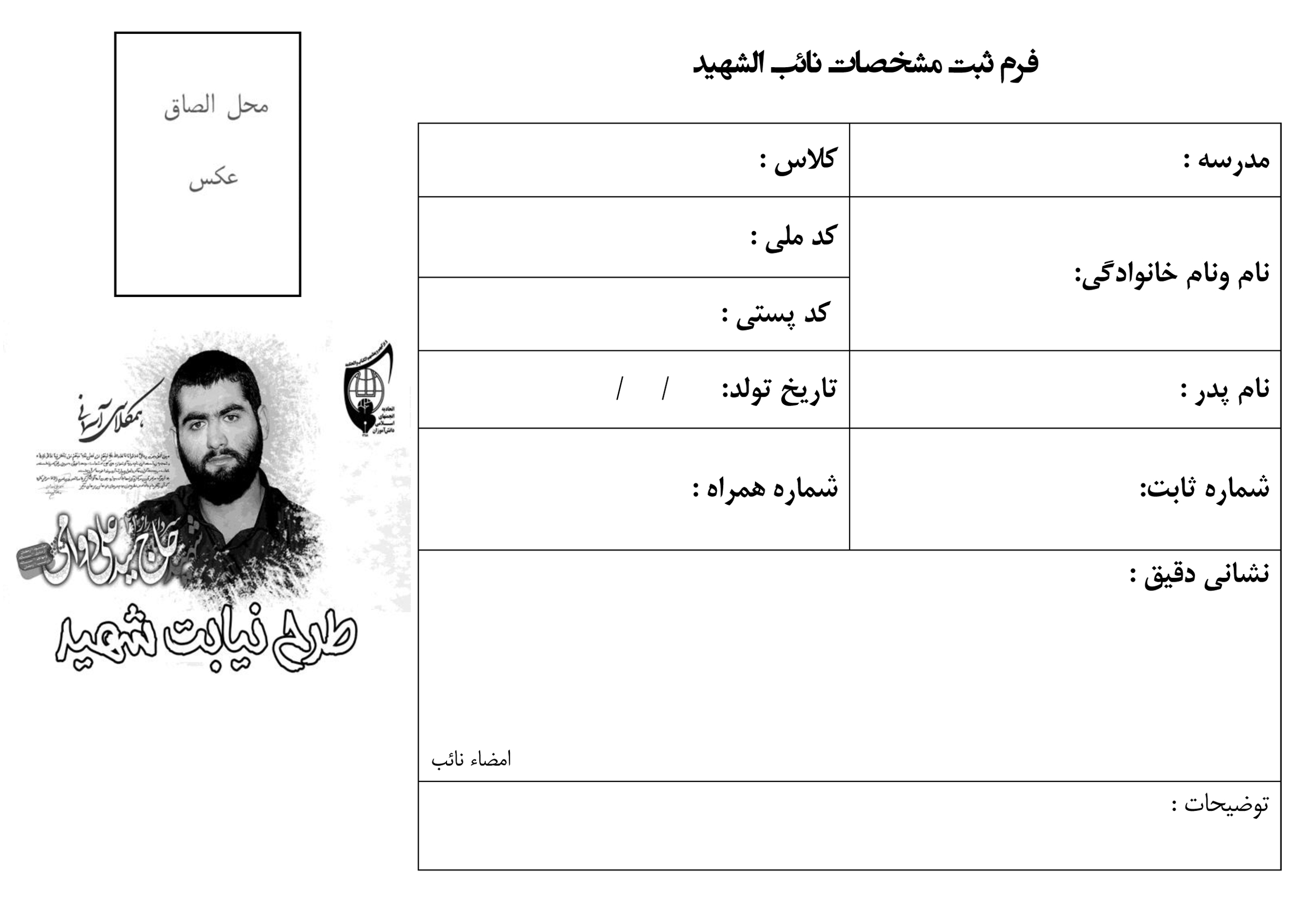 1 – حکم انتصاب ناب الشهید 2 –وصیت نامه و زندگینامه شهید 3 – سی دی حاوی تصاویر فیلم و کلیپ شهید 4 – آثار و دست نوشته های شهید 5 – برچسب شهید 6 – نشریه (در مورد شهید یا شهدا -سبز سرخ -امتداد و... )7-فرم ثبت مشخصات شخصی نواب(رابط کلاس)